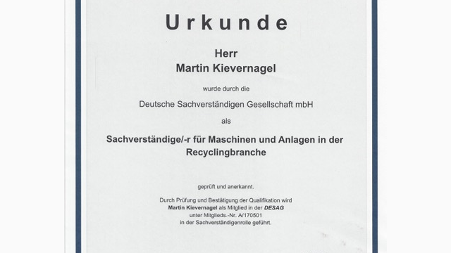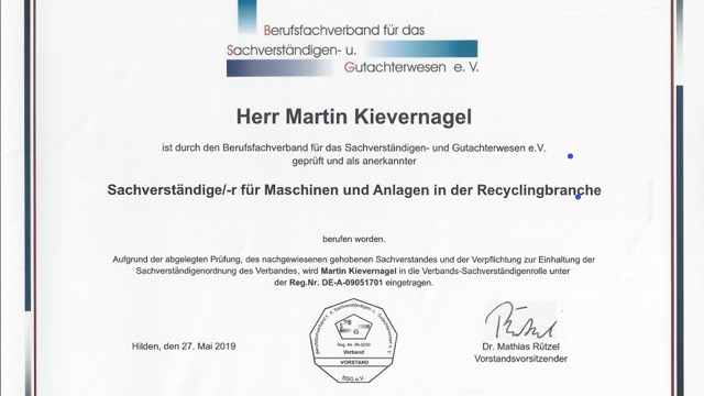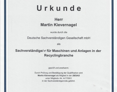 - Maschinensachverständiger der DESAG (Deutsche Sachverständigen Gesellschaft mbH) und der BSG e.V (Berufsfachverband für den Sachverständigen- und Gutachterwesen e.V.)